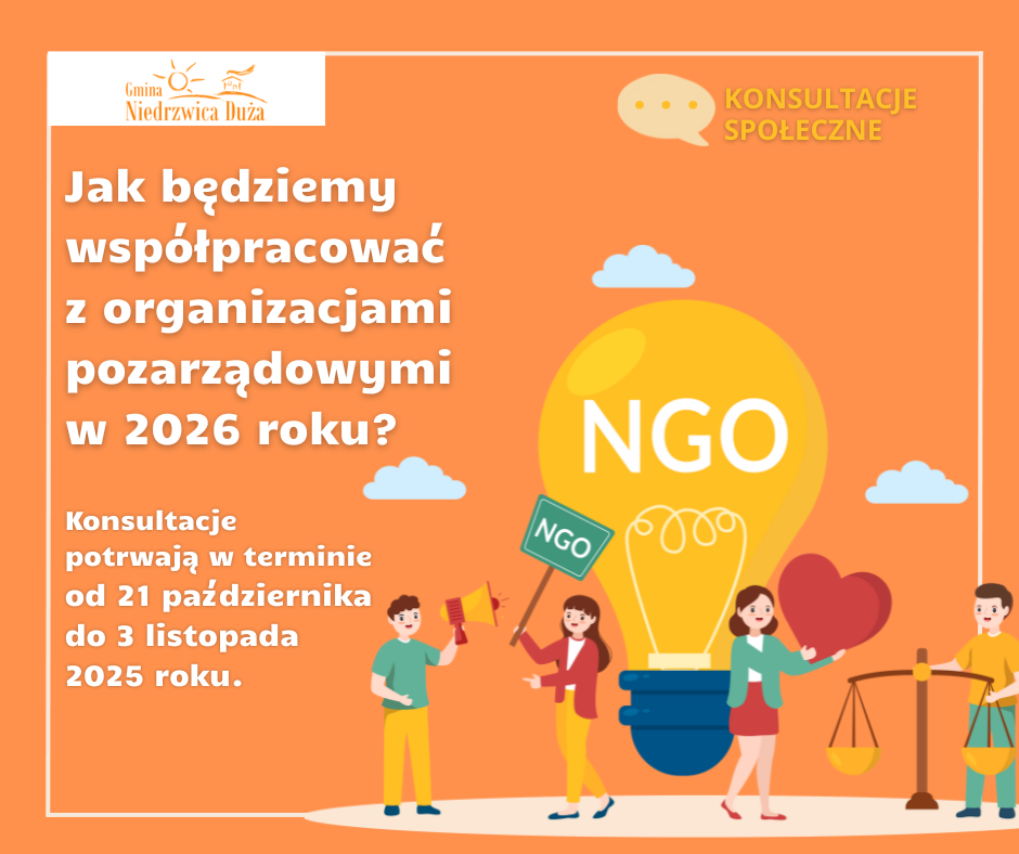 Wójt Gminy Niedrzwica Duża ogłasza konsultacje projektu uchwały w sprawie przyjęcia Programu współpracy gminy z organizacjami pozarządowymi i podmiotami prowadzącymi działalność pożytku publicznego na 2026 rok, które będą przeprowadzone w terminie od dnia 21 października 2025 r. do dnia 3 listopada 2025 r.