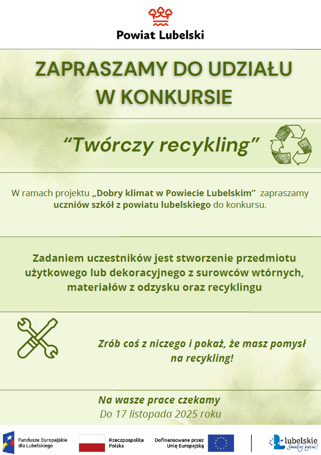Konkurs „Twórczy recykling"Starostwo Powiatowe w Lublinie zaprasza uczniów szkół z terenu powiatu lubelskiego do udziału w konkursie pn. „Twórczy recykling" organizowanego w ramach projektu „Dobry klimat w Powiecie Lubelskim".