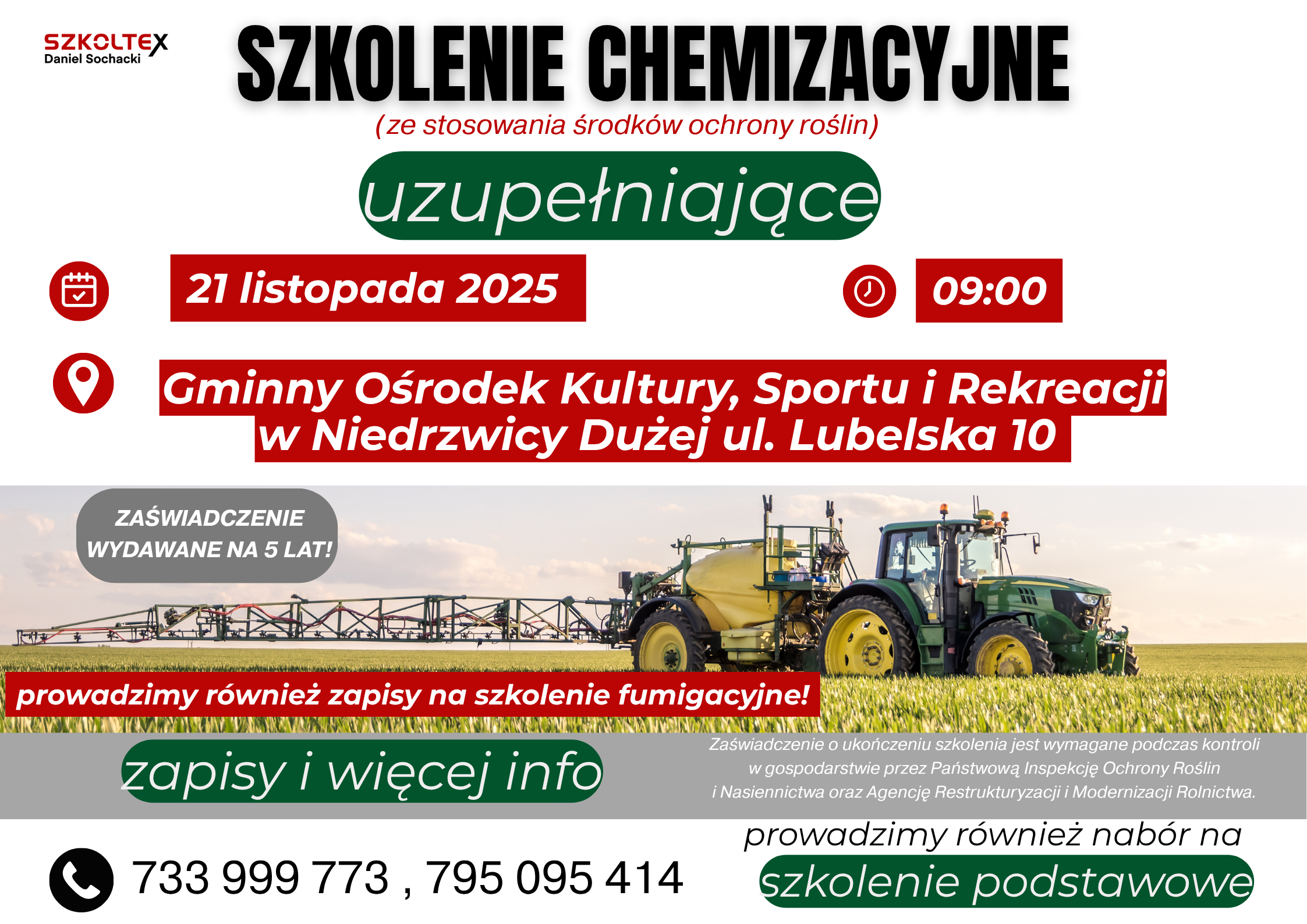Firma SZKOLTEX Daniel Sochacki zaprasza rolników do udziału w szkoleniu w zakresie stosowania środków ochrony roślin.
