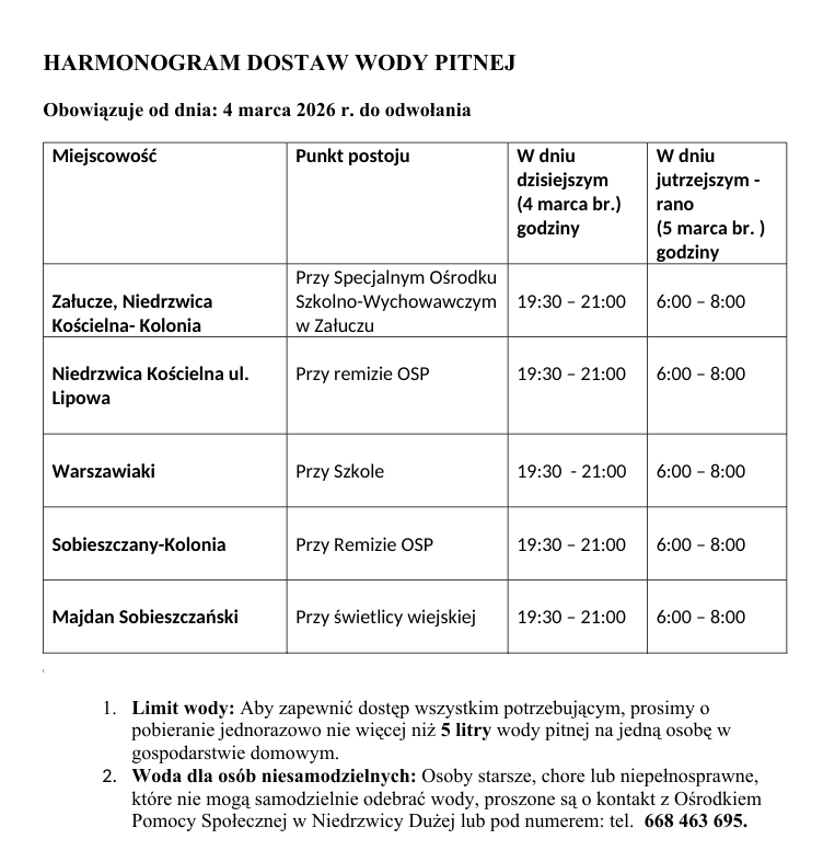 Harmonogram dostaw wody pitnej dla miejscowości objętych zanieczyszczeniem bakteryjnym sieci wodociągowej |
